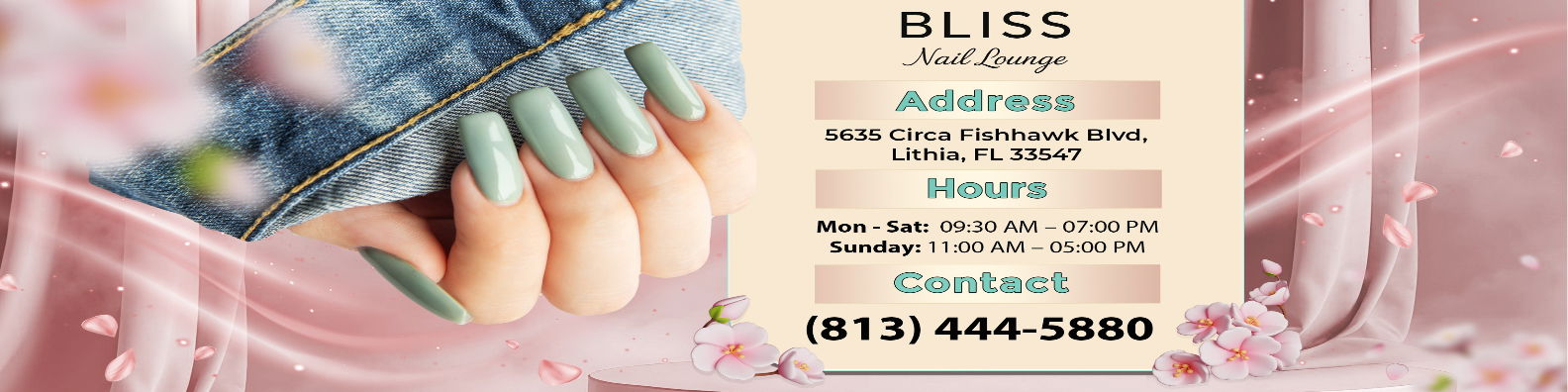 Bliss Nail Lounge is your go-to spot for luxury nail and spa services in Lithia. Located at 5635 Circa Fishhawk Blvd, Lithia, FL 33547, we offer manicures, pedicures, nail enhancements, waxing, and lashes in a clean, relaxing space. With over 1800 polish colors and a skilled team, every visit is a personalized, high-quality experience.At Bliss, beauty is a feeling—inside and out.Bliss Nail Lounge is located at 5635 Circa Fishhawk Blvd, Lithia, FL 33547, United States